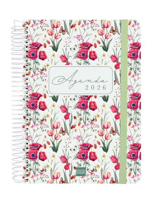 Agenda espiral para el año 2026 de la marca Finocam. Tipo de producto: agenda anual. Materiales utilizados: papel y cartón. Idioma: castellano. Diseño con un día por página, que proporciona espacio suficiente para escribir, con dos líneas por hora y un área lateral para tareas. Incluye planificación mensual en formato cuadriculado y un mensaje motivador al inicio de cada mes. Contiene información relevante como onomástica, festivos nacionales y días señalados. Secciones adicionales para datos personales, calendarios y control de gastos. Incluye un set de adhesivos temáticos. Fabricada con papel ecológico FSC, lo que asegura una gestión forestal responsable.
