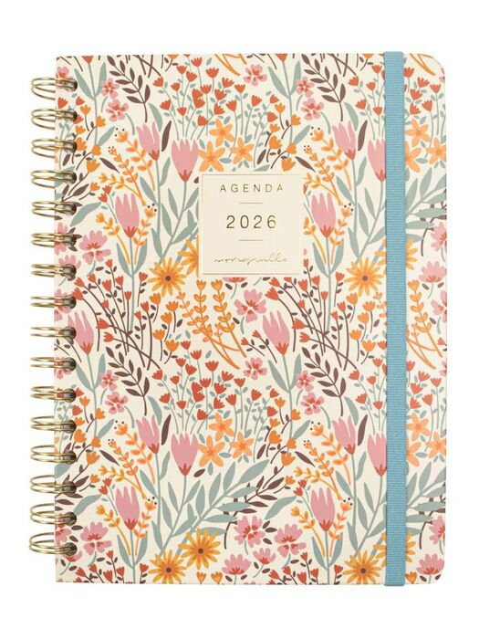 La agenda espiral doble año 2026 Moniquilla E10-155x212 mm es un producto diseñado para la organización personal. Presenta una tapa dura de cartón forrado con un acabado mate antirrayaduras. Incluye espiral doble, goma elástica y esquinas microperforadas para facilitar la localización del día o semana en curso. Su interior ofrece una vista horizontal de la semana y planificación mensual cuadriculada al inicio de cada mes. La agenda cubre el periodo de enero a diciembre de 2026 e incluye información sobre festivos en España, cambios de estación y días señalados. También contiene secciones adicionales como datos personales, calendarios, planificación anual, horarios, objetivos, un apartado para libros, películas, series y pódcast, hojas para anotaciones y tareas, contactos, adhesivos temáticos y dos marcapáginas. Está fabricada con papel ecológico FSC, contribuyendo a una gestión forestal responsable.