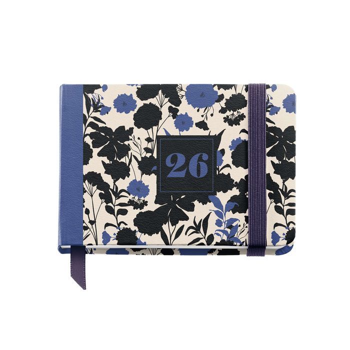 Cubiertas cosidas rigidas de cartón forrado, plastificado mate. Papel color marfil de 80 g/m², FSC Mix Credit. Tamaño: Pocket 105 x 74 mm. Anualidad: Semana a la vista horizontal (S/V), de Enero a Diciembre 2026. Idiomas: Castellano - Inglés - Portugués. Encuadernación cosida con cinta marcador. Bolsillo interior. Goma elástica para cerrar. Goma portabolígrafos. Contenido: Anualidad semana a la vista, datos personales, calendarios 3 años, planning mensual y hojas para notas.