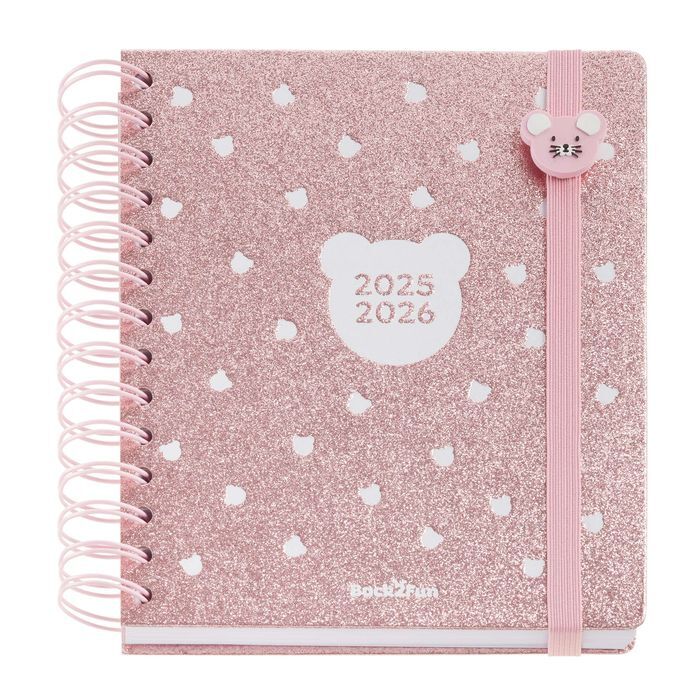 Cartón forrado en textura purpurina rosa. Encuadernación en wire-o. Cierre con goma. Incluye abalorio. Anualidad: Día página (D/P) 10 meses: Septiembre 2025 a Junio 2026 día página + Julio y Agosto 2 semanas a la vista. Papel: 90 g/m², FSC Mix Credit. Idiomas: Castellano - Inglés - Portugués. Tamaño: 155 x 180 mm Contenido: Datos Personales. Calendario curso. Horario trimestral. Maestros. Evaluaciones. Comunicación Escuela - Familia / Familia - Escuela. Espacio para tomar notas. Incluye abalorio. Incluye 2 páginas de stickers. Día por página D/P de lunes a viernes. Sábado y domingo en una misma página. Encuadernación wire-o con hojas microperforadas en la esquina para señalar la fecha actual. Páginas llenas de color y con divertidos detalles.