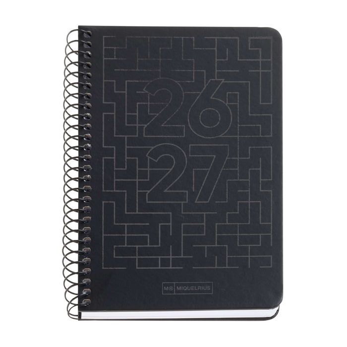 Cubiertas de polipropileno opaco. Cierre con goma. Encuadernación espiral metálica con hojas microperforadas en la esquina para señalar la fecha actual. Cantos redondeados. Anualidad: Día página (D/P) 12 meses: Septiembre 2026 a Agosto 2027. Papel: 80 g/m², FSC Mix Credit. Idiomas: Castellano - Inglés. Tamaño: PLUS (4º): 150 x 213 mm. Contenido: Datos personales. Calen...