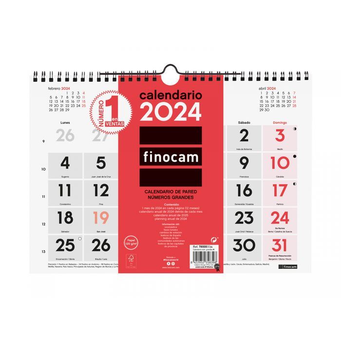 Calendario anual de pared con números grandes para una visión rápida del mes. Encuadernado con doble espiral y con colgador. Con mes anterior y posterior en cada página. Calendario con información útil y de interés. Ideal para oficinas, salas de reuniones o hogares.