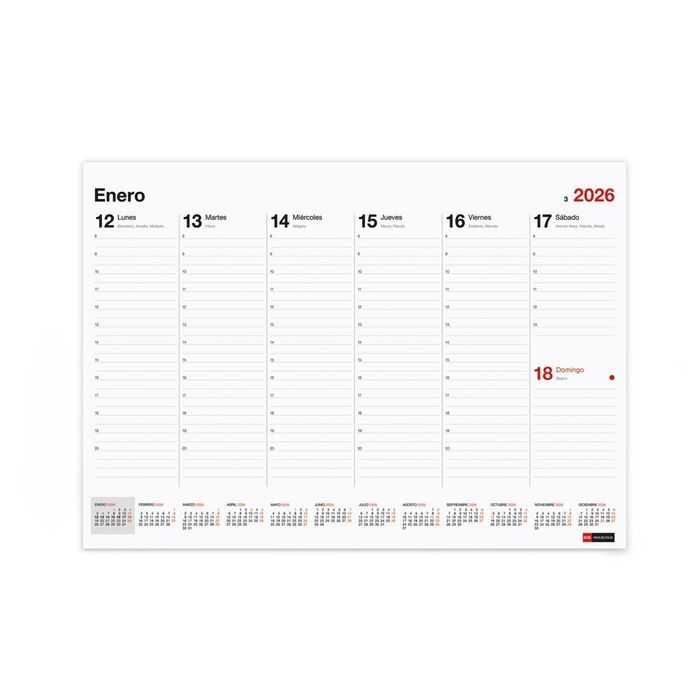 Vade de sobremesa. Anualidad: Semana vista. Papel: 90 g/m². FSC Mix Credit. Idioma: Castellano. Tamaño: A3 (420 x 296 mm). Contenido: Calendario anual al pie de cada semana. Festivos nacionales, autonómicos y capitales de provincia. Planning 2027. Fases lunares y onomásticas. Días en que cambia la hora. Carátula explicativa. Encuadernación: Encolado en la base.