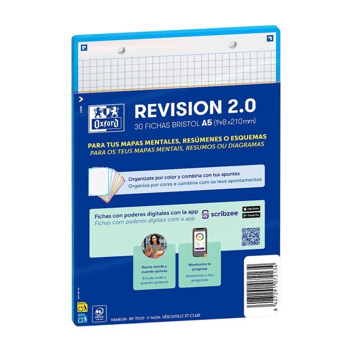 FICHAS DE ESTUDIO MEDIDA A-5 (148 X 210 MM), INTEGRADAS CON LA APLICACIÓN GRATUITA SCRIBZEE QUE TE PERMITE DIGITALIZARLAS Y REPASAR EN CUALQUIER MOMENTO. FABRICADAS CON CARTULINA PREMIUM DE 250G. RAYADO CUADRO 5X5 POR AMBAS CARAS Y 2 TALADROS