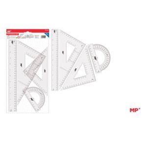 Set de reglas: escuadra, cartabón, semicírculo y regla. Fabricadas en plástico transparente. Medida de la regla: 30 cm. Presentación en petaca de plástico.