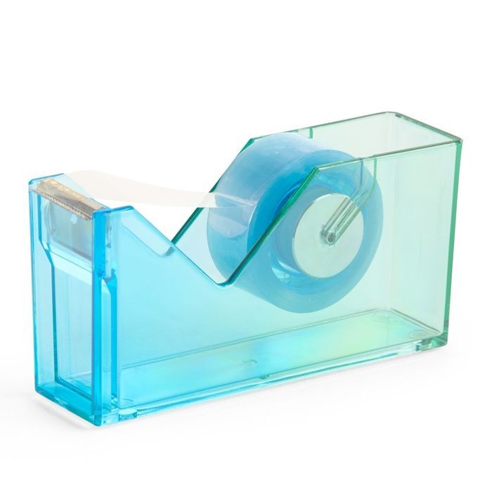 Porta Cinta Adhesiva Azul - Verde. Caja: 130 x 75 x 37 mm. Porta cinta adhesiva: 126 x 62 x 36 mm. Material: Poliestireno y metal. Material transparente. Efecto degradado. Presentado en caja PVC.
