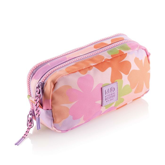 2 compartimentos. 1 de ellos es bolsillo organizador, con bolsillos internos. Cremalleras de plástico. Tiradores de cuerda. Silicona MR rosa. Material exterior: RPET. Forro interior de poliéster.