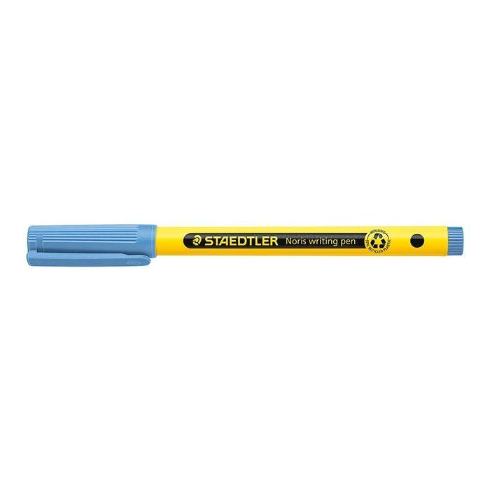Fineliner con cuerpo en colores amarillo y negro y capuchón en color de la tinta. Carcasa fabricada en un 97% de plástico reciclado (cuerpo, capuchón y embellecedor) según ISO 14021. Punta antisecado DRY SAFE resistente a la presión. Lavable sobre la mayoría de tejidos. Punta F (aprox. 0,6mm). azul cálido Caja con 10 fineliners del mismo color.