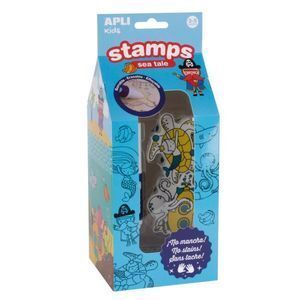 Set de sellos con una almohadilla de tinta borrable, modelo Sea Tale Kids. Cada set contiene 6 sellos con temática marina, una almohadilla de tinta de color negro y un rotulador borraor para limpiar la tinta de tejidos y muebles. Divertidos sellos con los dibujos a estampar en color en la parte superior. Tinta no tóxica y fácilmente lavable en piel y ropa.