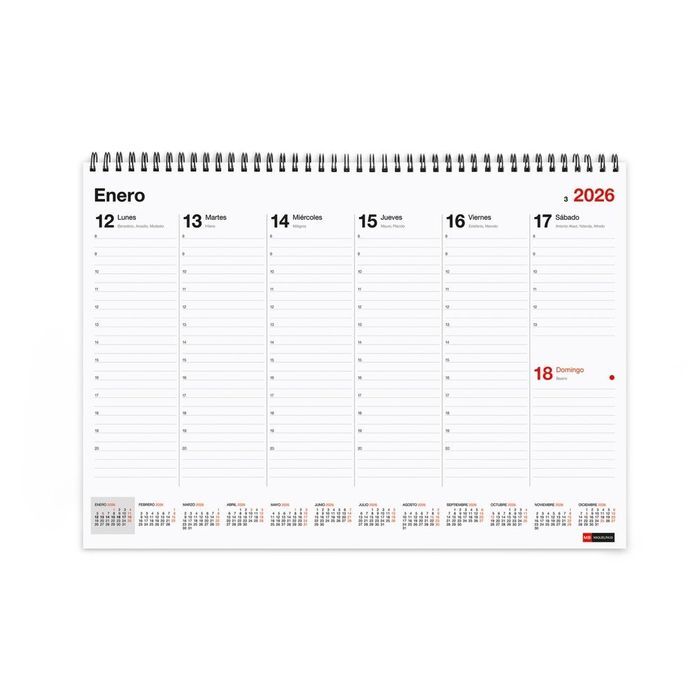 Vade de sobremesa. Anualidad: Semana vista. Papel: 90 g/m². FSC Mix Credit. Idioma: Castellano. Tamaño: A3 (420 x 296 mm). Contenido: Calendario anual al pie de cada semana. Festivos nacionales, autonómicos y capitales de provincia. Planning 2027. Fases lunares y onomásticas. Días en que cambia la hora. Carátula explicativa. Encuadernación: Espiral doble.